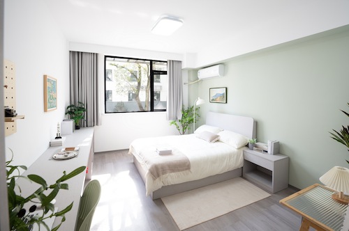 公寓二期的每套房间都是精装修,浅绿色和浅灰色混搭,色调很有质感。房间内,桌椅、空调、整体卫浴等配套设施一应俱全,入户门安装有智能门锁,还设有消防和监控系统,风格简洁清爽,环境温馨怡人,拎包即可入住。